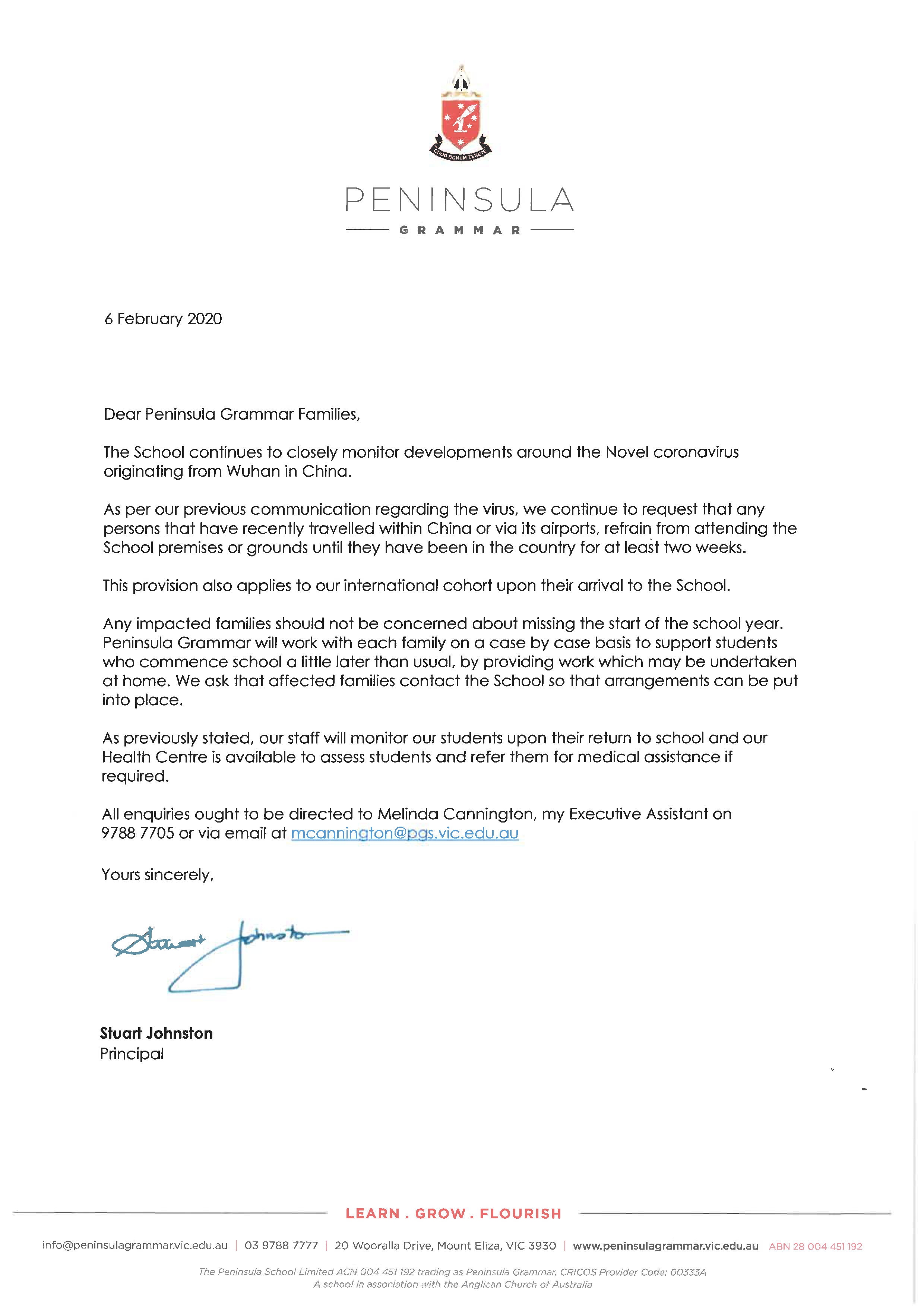 Our Principal Mr Johnston has written to families with an update about provisions the School has made to manage potential threats caused by the Coronavirus.